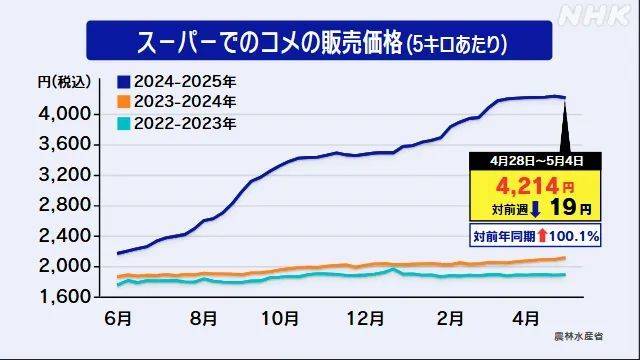 自2024年秋季以来,日本米价开始疯涨,到了2025年,情况更是雪上加霜。据报道,4月28日至5月4日,全国超市5公斤大米的平均价格高达4214日元(约合人民币200元),比去年同期翻了一倍。
