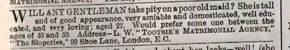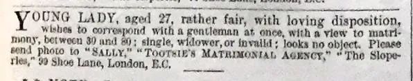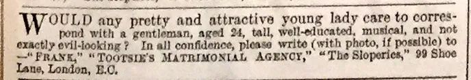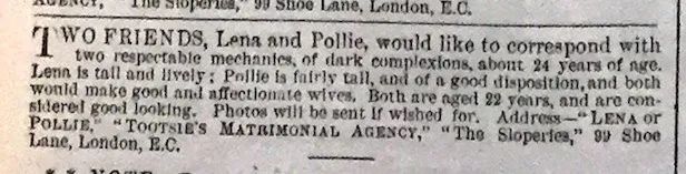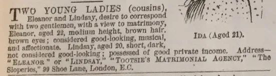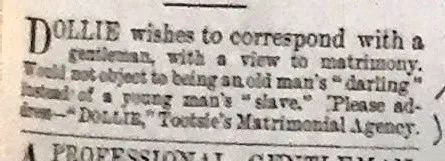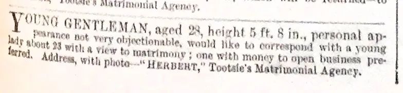 1896年,一个名为甜心婚介所(Tootsie’s Matrimonial Agency)的新栏目出现在一份发行量高达35万的报纸上,为单身人士提供了寻找对象的渠道。