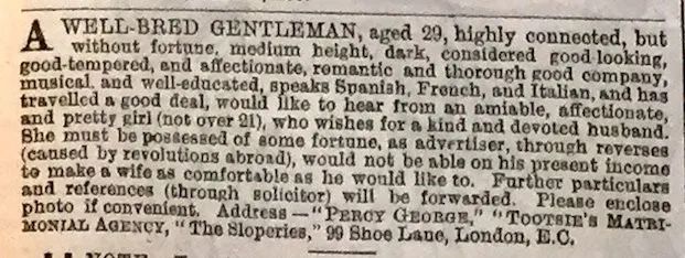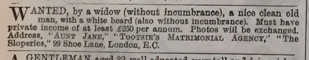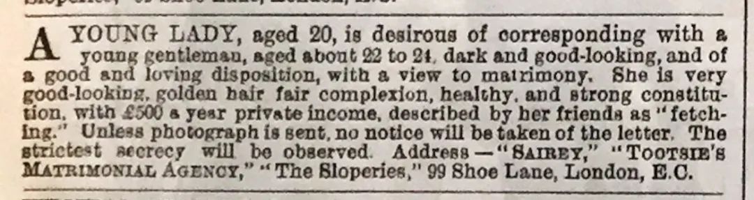 这些启事在经济方面的直率令人震惊。参考一下,当时男性的平均年收入是200镑,同样的工作,女性的收入是前者的一半。多金的男人毫不掩饰他们的诉求……