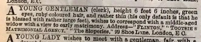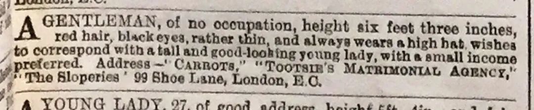 一位年轻的绅士(职员),身高6英尺6英寸,绿色的眼睛,红宝石色的头发,相当瘦(与众不同的是上帝给了他一双非常大的脚),希望与一位中年寡妇交流。