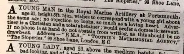 一个来自朴茨茅斯皇家海军陆战队炮兵的年轻人,21岁,身高5英尺7.5英寸,希望与同龄的年轻女孩通信;长相不重要,只要有一颗有爱的心。他是一个基督徒,完全禁欲;想要有一个家庭佣人。