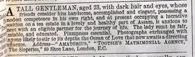 一位高大的绅士,23岁,深色的头发和眼睛,英俊,有成就,优雅,独立,目前在阿萨姆邦的一个茶园工作,回报丰厚。渴望在生命的旅程中遇到一个合适的伙伴,这位女士需浅色皮肤,亲切,受过教育。丰满的身材必不可少。