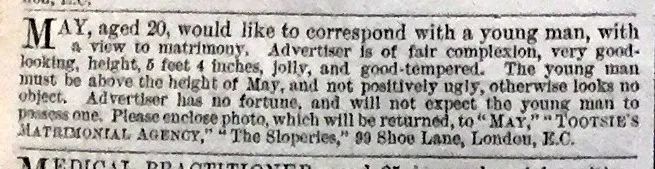 一位年轻的女士,19岁,希望与一位不超过24岁的男士通信。她身材高挑,相貌好看(通常的标准下),每年有700英镑的收入。至于对象的要求,他必须长得很好......