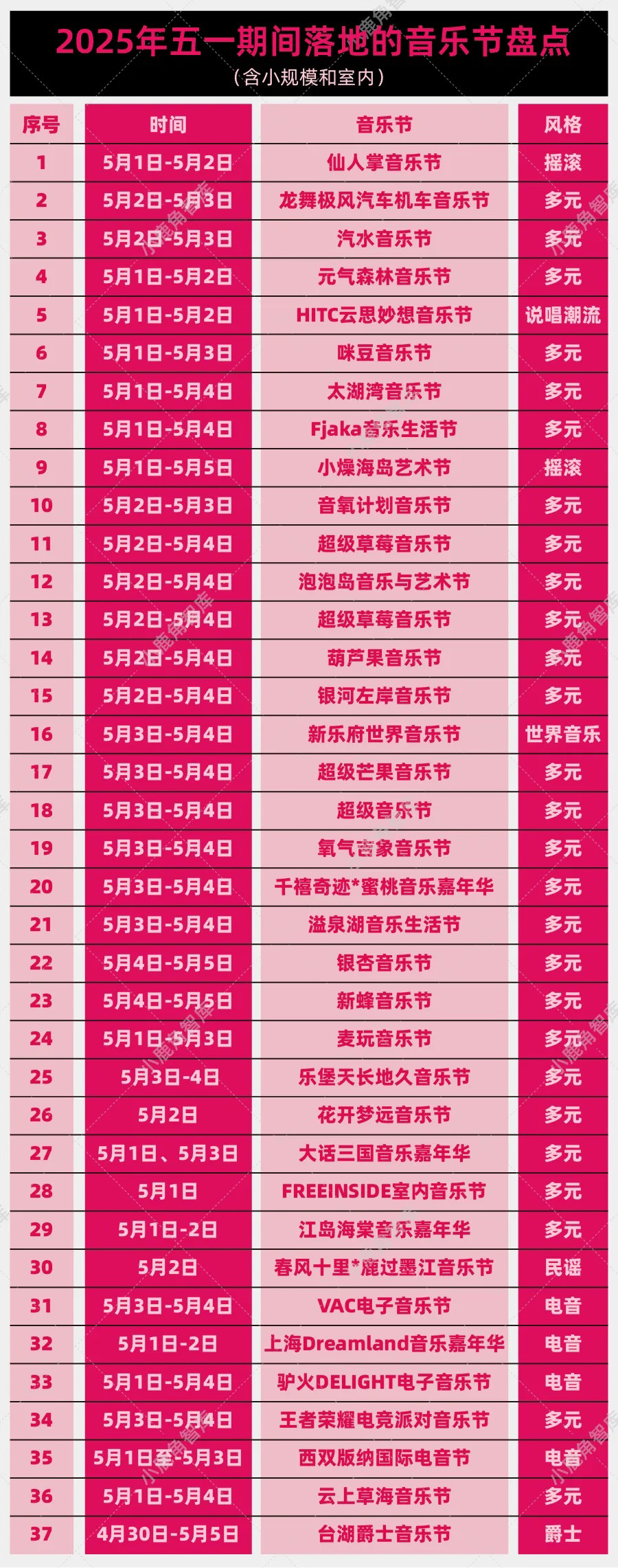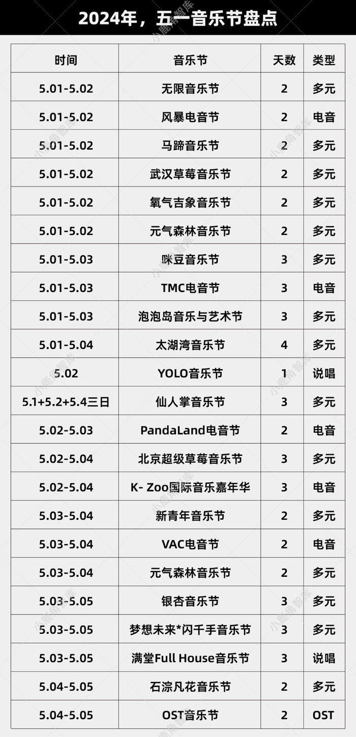 我们可以简单对比2024年和2025年五一期间举行的音乐节风格和类型。去年,五一黄金周音乐节市场呈现出持续繁荣的状态,艺人阵容更为多样化,这使得多元化类型的音乐节已然占据主流。在23个音乐节中,多元型音乐节占据了15档。