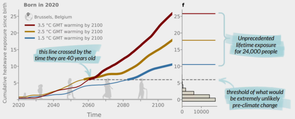 例如,在全球升温2.5°C的情景下,2020年出生在布鲁塞尔的孩子一生中预计将经历大约18次热浪;而出生在柏林的人则预计仅会经历9次。
