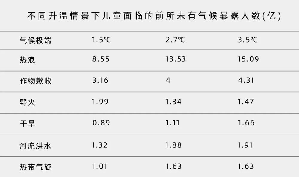 而上述数据还仅仅针对2020年出生的一代;如果将目前5至18岁的所有儿童都考虑在内,在3.5°C升温的情景下,受影响人数将累计达到15亿人;如果将升温控制在1.5°C之内,则可保护6.54亿儿童免于风险。