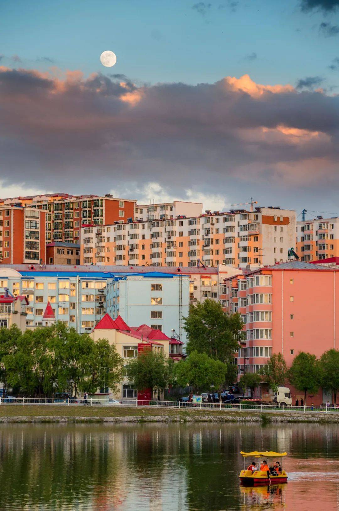 在绥芬河市中心不远处有一个公园,可以看到绥芬河市的全景。我去的那天,天气晴朗,空气清新,很多当地人在这里休息遛弯儿。傍晚时分,游人在湖中划着小船,云彩一点点变红,太阳缓缓落下,月亮慢慢升起。