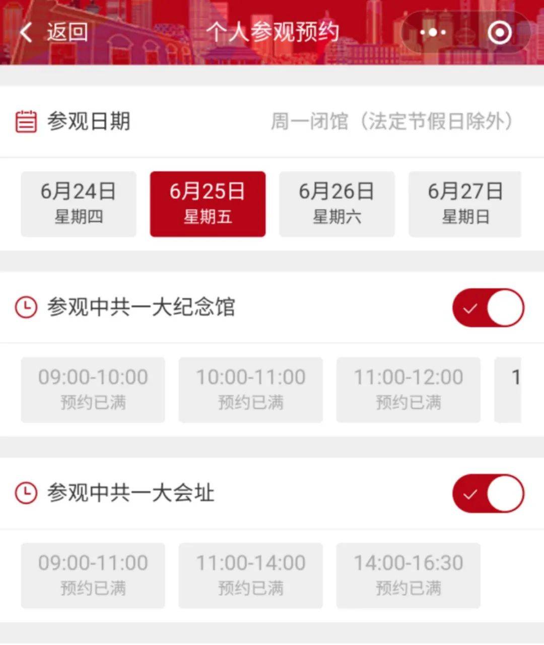 23日,中新经纬在“中共一大纪念馆”官方微信公众号上查看个人参观预约情况发现,6月24日及25日,参观中共一大会址的门票已全部约满,截至发稿,参观中共一大纪念馆还剩一张票。此外,中共一大纪念馆在26日、27日及29日的参观门票已全部被预约。
