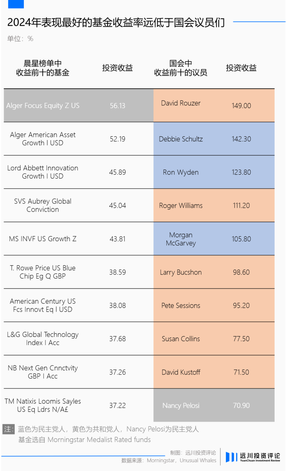 相比之下,晨星评选出的美国2024年前十佳基金,第一名的收益率不过56.13%,在国会山的世界里,甚至拿不到自己的号码牌。