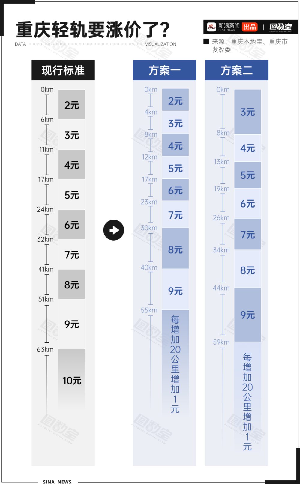此次票价调整一共有两种方案,一是缩短起步里程,以前2元钱可以坐6公里轨道,现在只能坐4公里了;二是提高起步价,0~8公里(包含)的范围,票价均为3元。目前重庆城市轨道交通线网最长单程计费里程为88公里,方案一及方案二对应的票价均为11元。