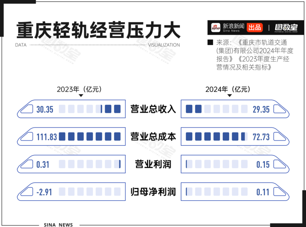 2023年重庆轨道交通总营收为30多亿,但运营成本却超过111亿,归母净利润为负;2024年重庆轨道交通总营收29.35亿元,营业总成本72.73亿元,虽扭亏为盈,但归母净利润仅为1100万元。