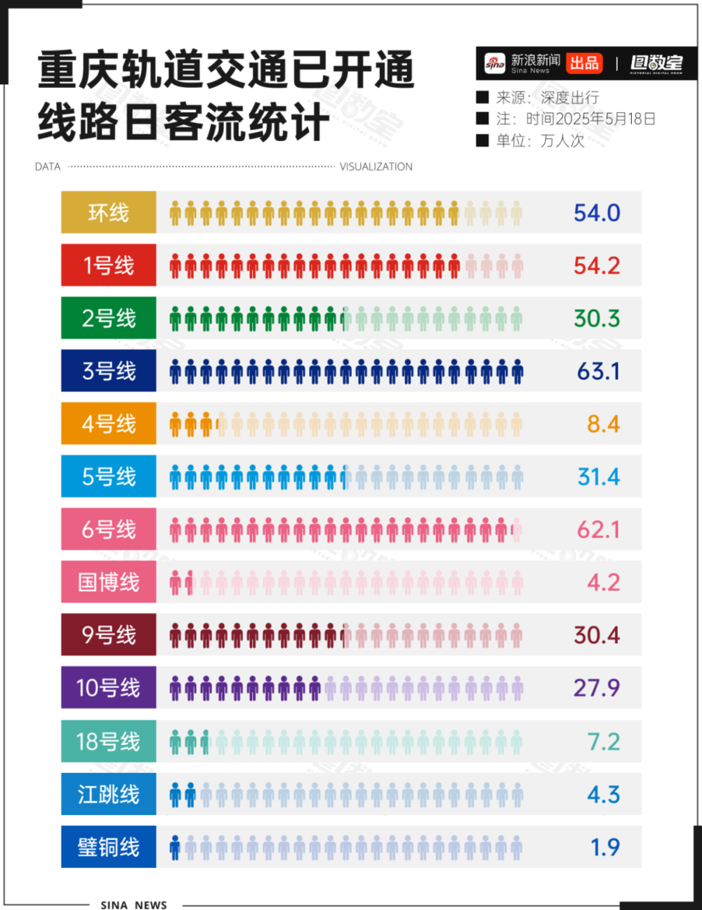 从5月18日重庆各条轻轨日客流量来看,3号线和6号线是客流量最大的两条线路,日均客流分别达到63.1万和62.1万人次,成为整个轨道网络的客流主力,而客流量最少的璧铜线只有1.9万人次,仅仅为3号线的3%。