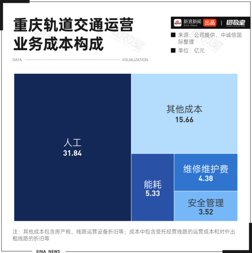 地铁的建设成本非常高,少则5~6亿元/公里,多则超过10亿元,日常运营成本也不低。《重庆市轨道交通(集团)有限公司 2023 年度跟踪评级报告》指出,重庆轨道交通运营成本仍主要由人工、能耗、维修维护费和安全管理等相关类别支出构成,其中人工成本占比最高,为31.84亿元,在60.73亿的总成本中占比超五成。