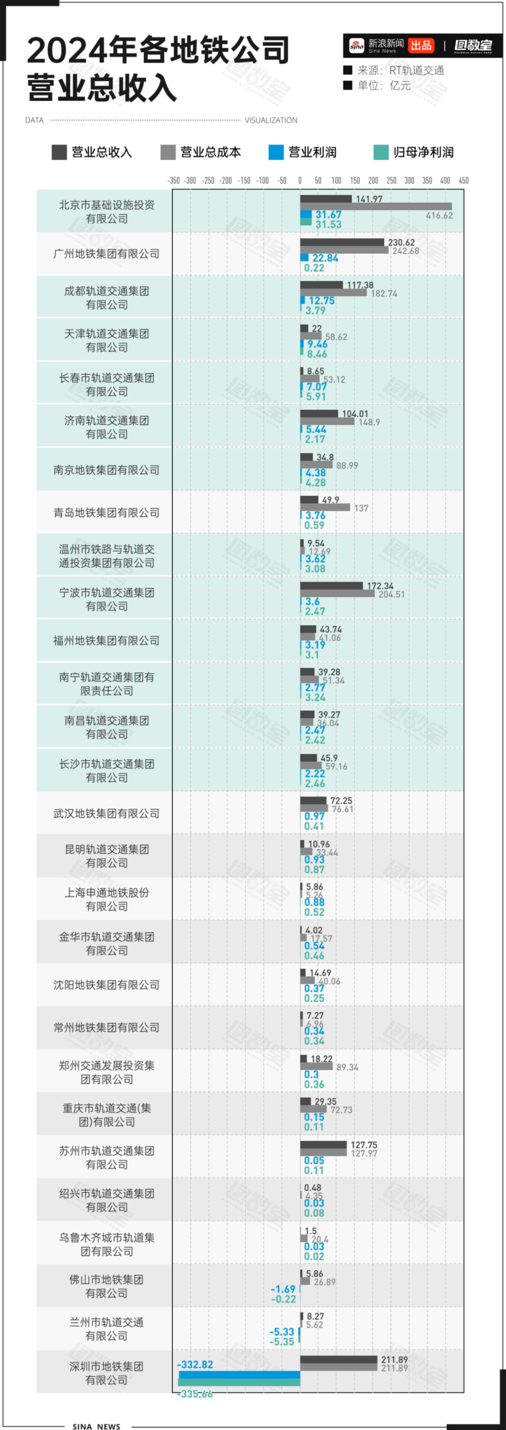除了重庆,其他城市的地铁赚钱也都不容易。别看营业总收入高达几百亿,减去营业总成本,利润就剩下了零点几亿,个别地铁还亏钱。