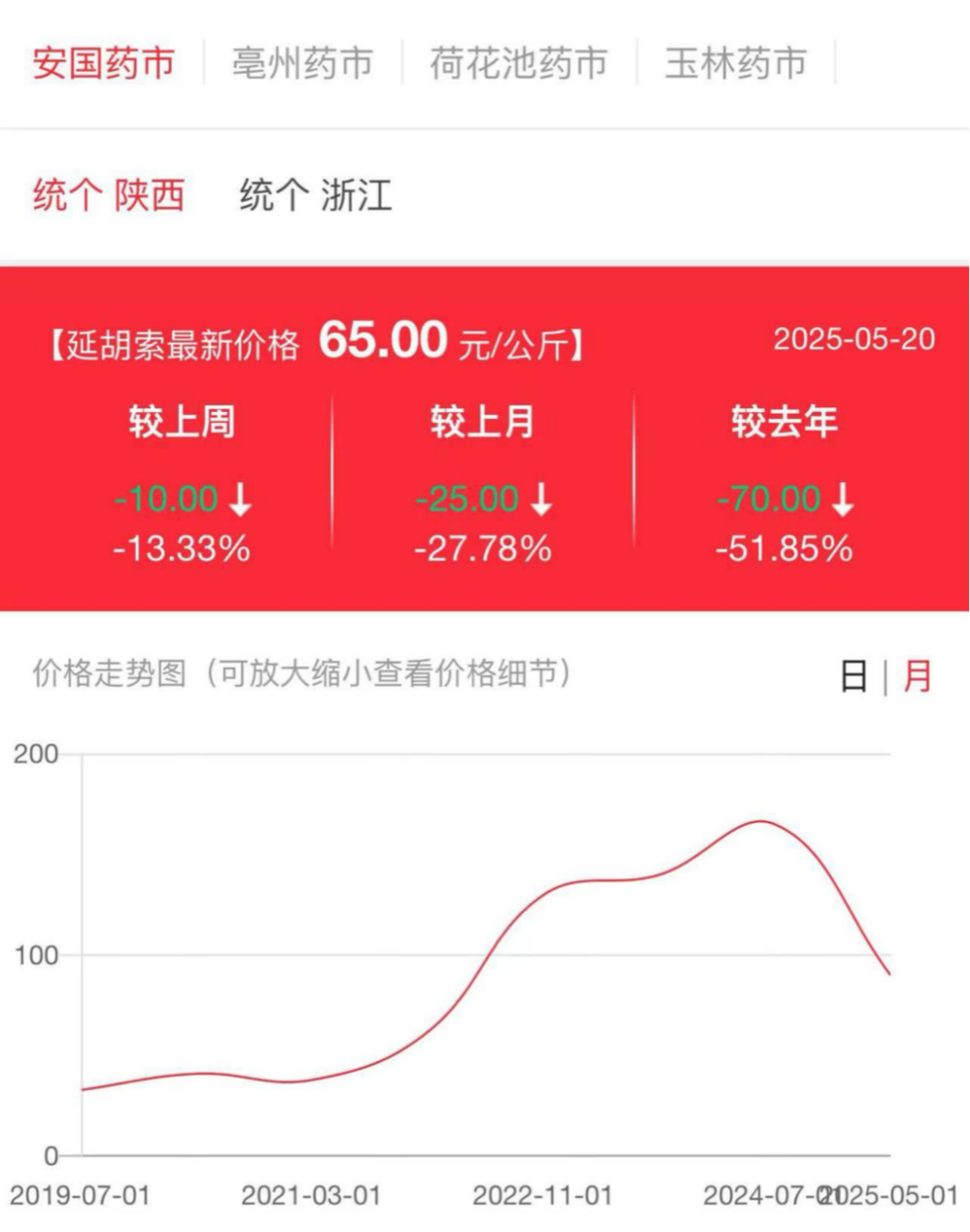 不过,从2023年~2024年下半年开始,酸枣仁和延胡索价格分别出现了下跌趋势。其中,酸枣仁2024年7月份跌到了520元每公斤,10个月下跌了530元,跌幅超50%,目前价格维持在约400~500元每公斤。陕西产延胡索最新价格为65元每公斤,与去年同期相比,价格下降70元,跌幅高达约52%。