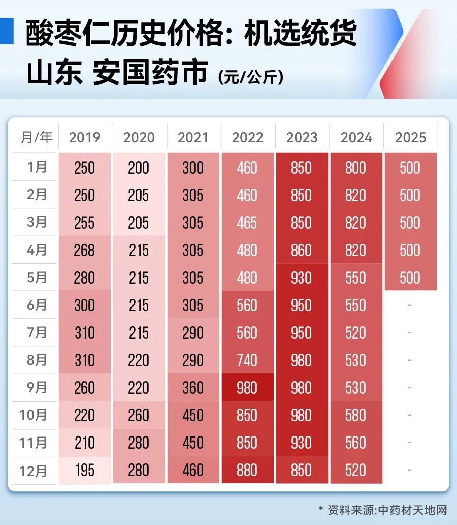 中国中药协会中药生态农业专业委员会委员刘红卫在接受《每日经济新闻》记者采访时表示,2020年8月份以前,酸枣仁的价格一直平稳,2020年9月份,由于受灾减产,价格一路上涨,从200元每公斤起步,6个月上升为300元每公斤。2021年产新时,“抢青”(提前采收)严重,而且减产加剧,价格进一步上涨至450元每公斤。2022年1月,涨到470元每公斤,2023年6月份涨到1050元每公斤。
