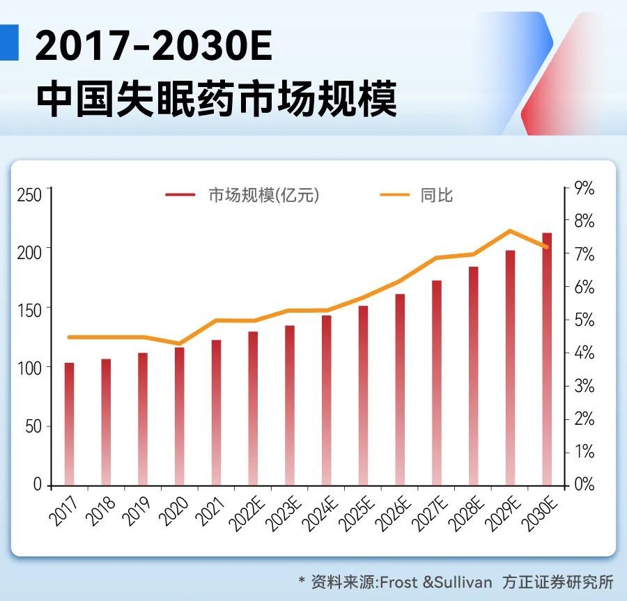 咨询公司Frost&Sullivan(弗若斯特沙利文)的分析预测,中国失眠症患者数量将从2017年的2.5亿人增长至2030年的3.3亿人,年复合增长率为2.9%。与此同时,失眠症药物市场规模也呈现出强劲的增长势头,预计从2017年的103亿元增长至2030年的212亿元。