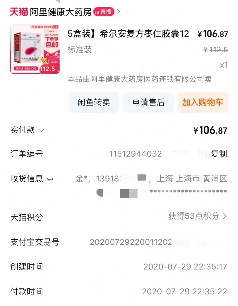网友金小米2020年订单显示,5盒(瓶)复方枣仁胶囊售价106.87元,单瓶价格约21元 图片来源:受访者供图