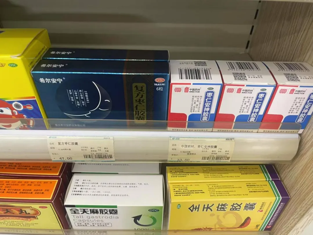 药店在售的复方枣仁胶囊及同类药物 图片来源:每经记者 甄素静 摄