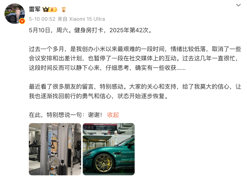 上周六,雷军终于结束“战略性沉默”,发了一条较长的微博自述过去一个月的心路历程,感谢支持者的关心,并且恢复了健身打卡。