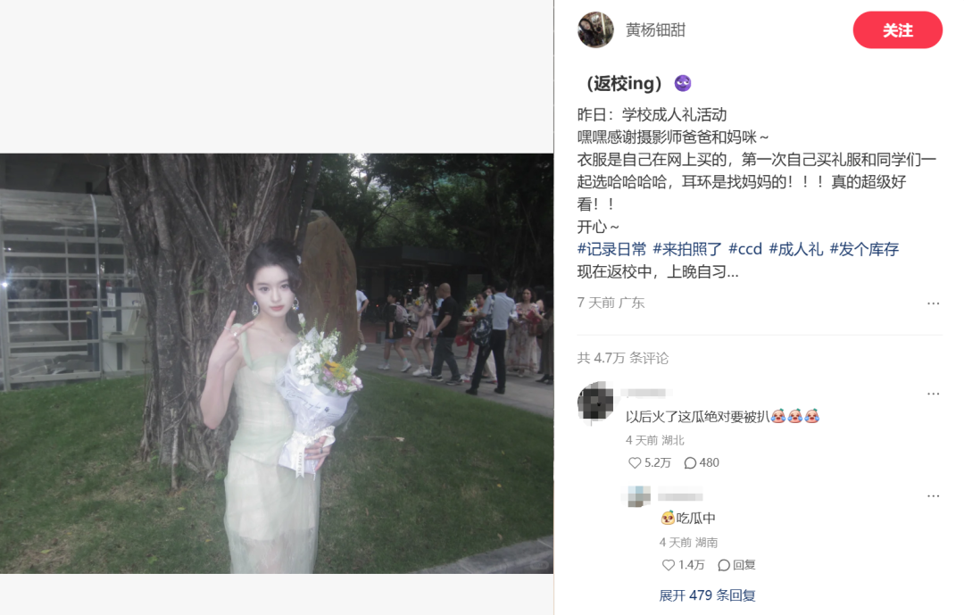 2025年5月11日,曾饰演“小楚乔”“小如懿”的演员黄杨钿甜,在社交平台分享了成人礼照片,超不经意多次秀出大耳环,高糊像素都掩盖不了宝石的光彩。