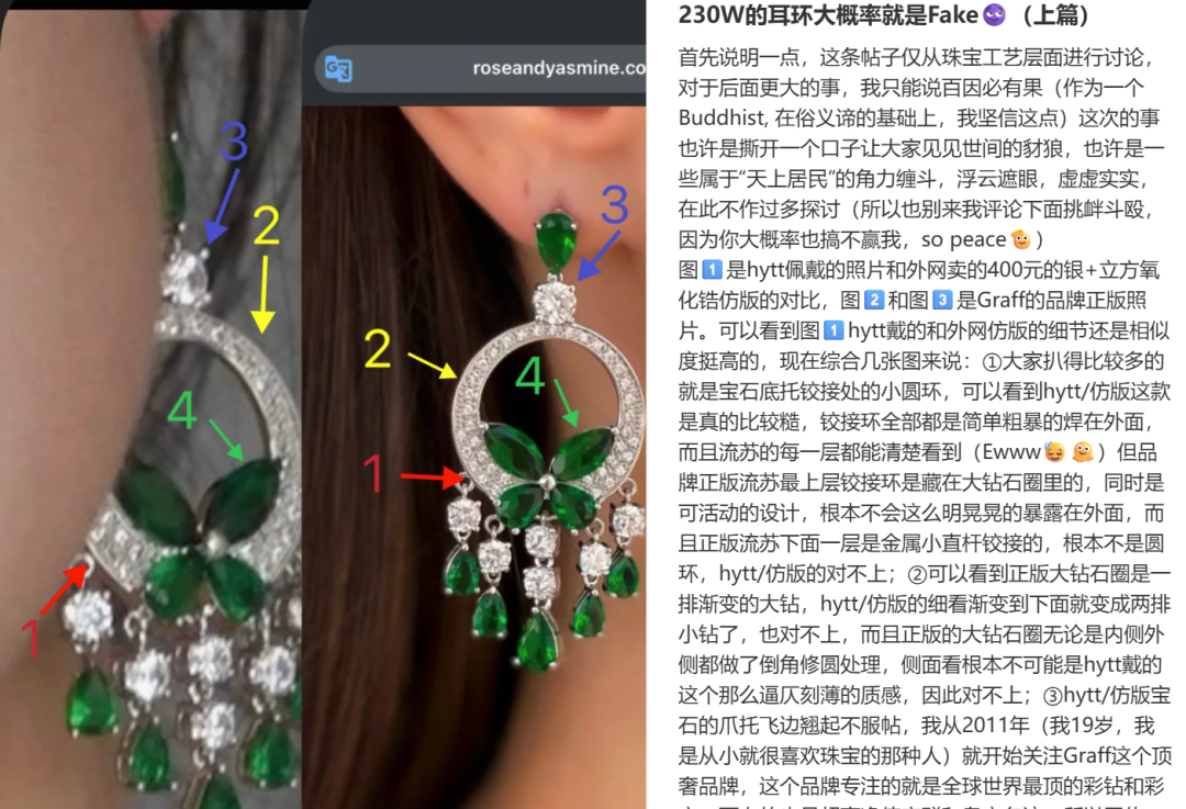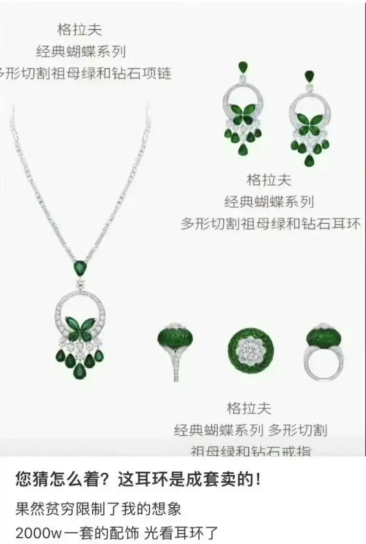 立马有网友扒出耳环疑似奢侈品牌Graff经典系列祖母绿钻石款,公价约230万元,相当把二三线城市一套房挂耳朵上了。