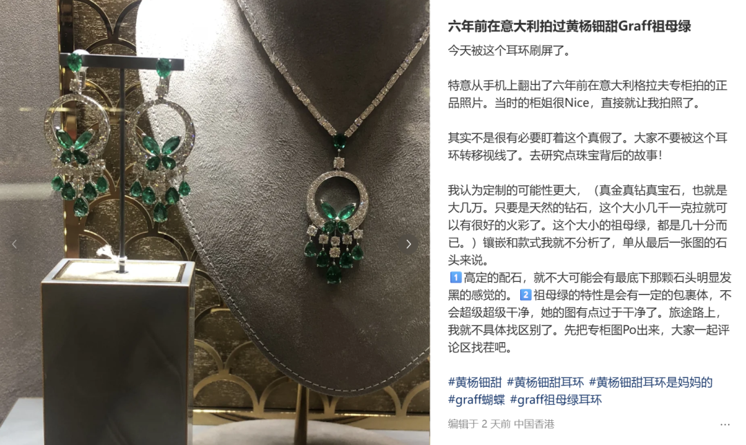 但她6年前曾在米兰Graff专柜见识过全系列正品,“耳环上的祖母绿单颗都不超过1克拉,我个人认为并不属于这个(不单拆售卖)范畴。”