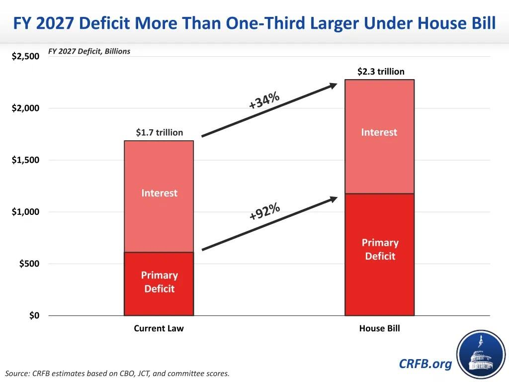 而负责任联邦预算委员会(CRFB)的估计更为悲观,认为该法案将在2027财年(政策完全生效的第一年)使赤字大幅增加近6000亿美元,即GDP的1.8%。这将使预计的总赤字从1.7万亿美元增加到2.3万亿美元,几乎使基本赤字(不含利息)翻倍。