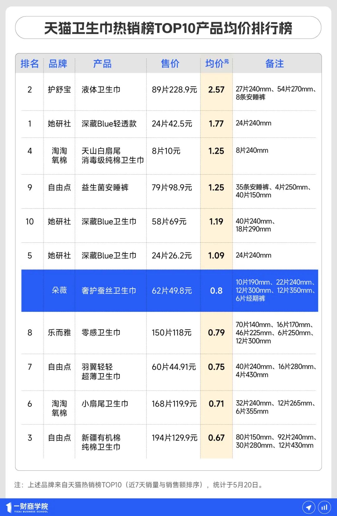 一财商学院统计了天猫卫生巾热销榜TOP10,从单片价格来看,朵薇均价略低于她研社、护舒宝等行业头部品牌,与其他品牌基本持平。