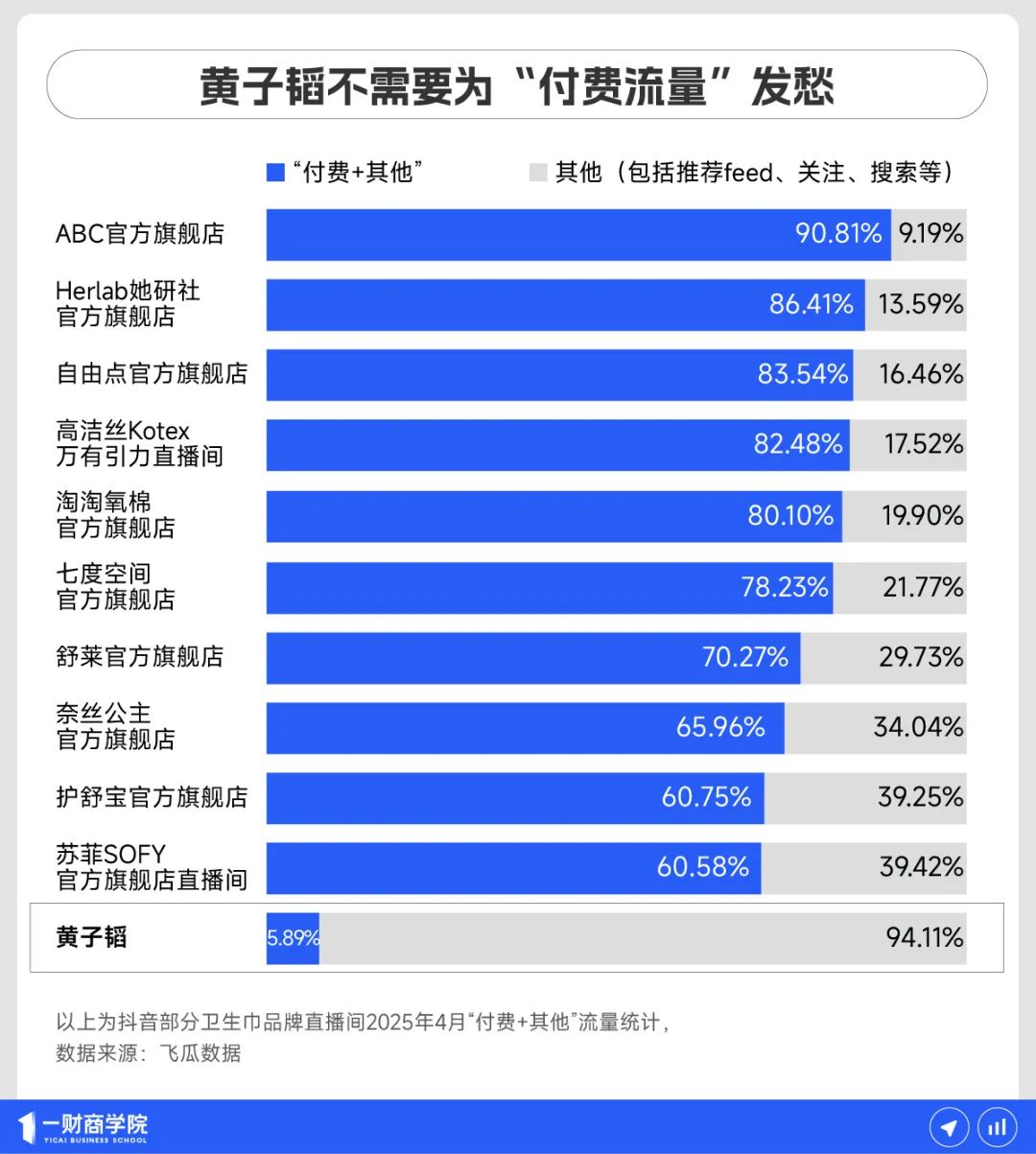 在线下传统商超中,卫生巾分销依赖多重经销商体系,层层加码在一定程度上助涨了卫生巾的价格。而在线上,这些品牌也相当依赖付费投流。飞瓜数据显示,自由点、她研社、高洁丝等品牌抖音旗舰店的付费流占整体流量比都在80%以上,ABC官方旗舰店的付费流占比更是高达90%。