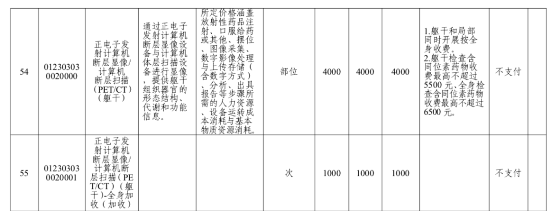 依据该通知,上海明确局部PET/CT检查在本市一级、二级、三级医疗机构的收费标准统一为2500元,同时规定含同位素药物收费不超过4000元(即同位素药物单项收费上限1500元,以下类同);躯干PET/CT收费标准为4000元,同时规定躯干检查含同位素药物收费最高不超过5500元;全身检查含同位素药物收费最高则不超过6500元。