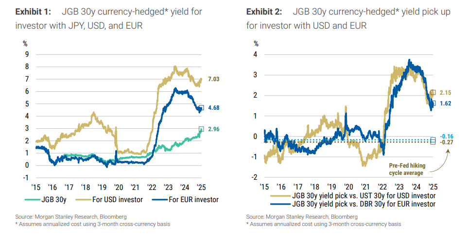 对美元投资者而言,30年期日债货币对冲后收益率高达7.03%,高于30年期美债的4.96%;