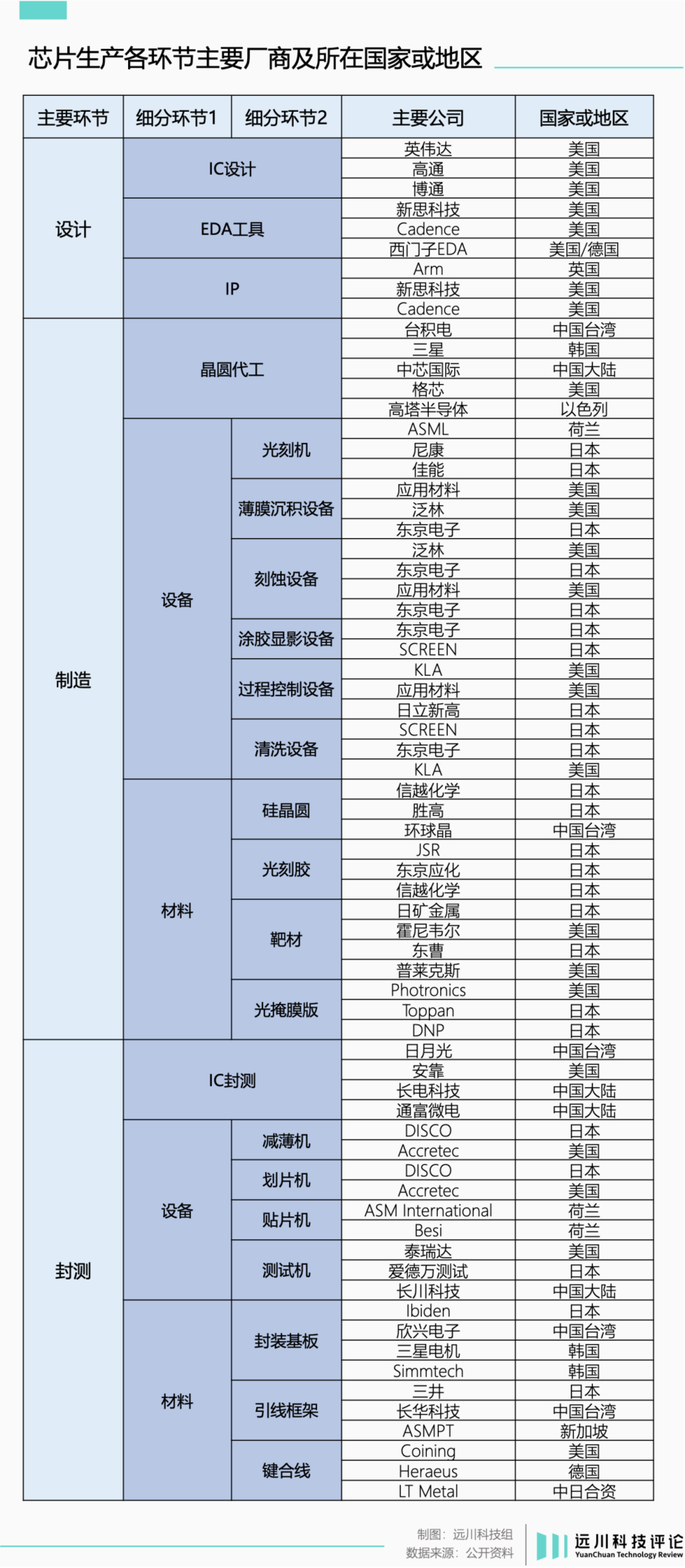 芯片设计完成后,流片和生产环节可以由台积电、三星电子、格罗方德这类代工厂完成。这些代工厂又需要使用ASML提供的光刻机,应用材料提供的刻蚀设备,东京电子提供的涂胶显影设备,科磊提供的检测设备。