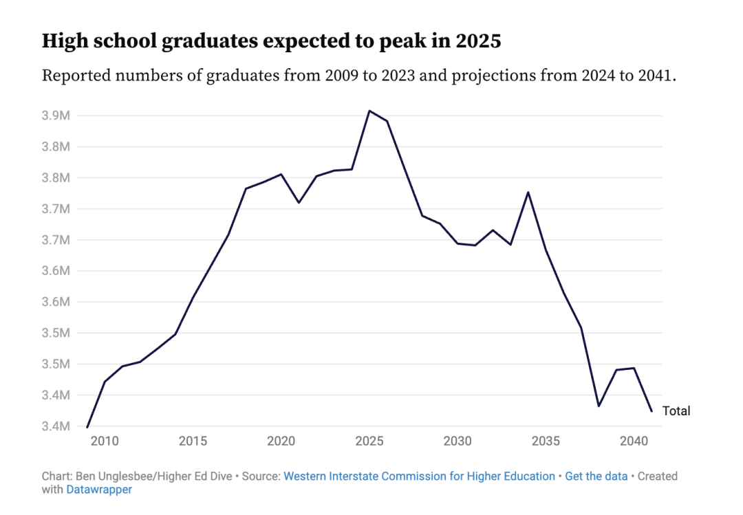 根据西部州际高等教育委员会(WICHE)的年度报告,2025年将成为美国高中毕业生人数的峰值年份,约为390万人,随后将逐年下滑,到2041年减少至340万人。