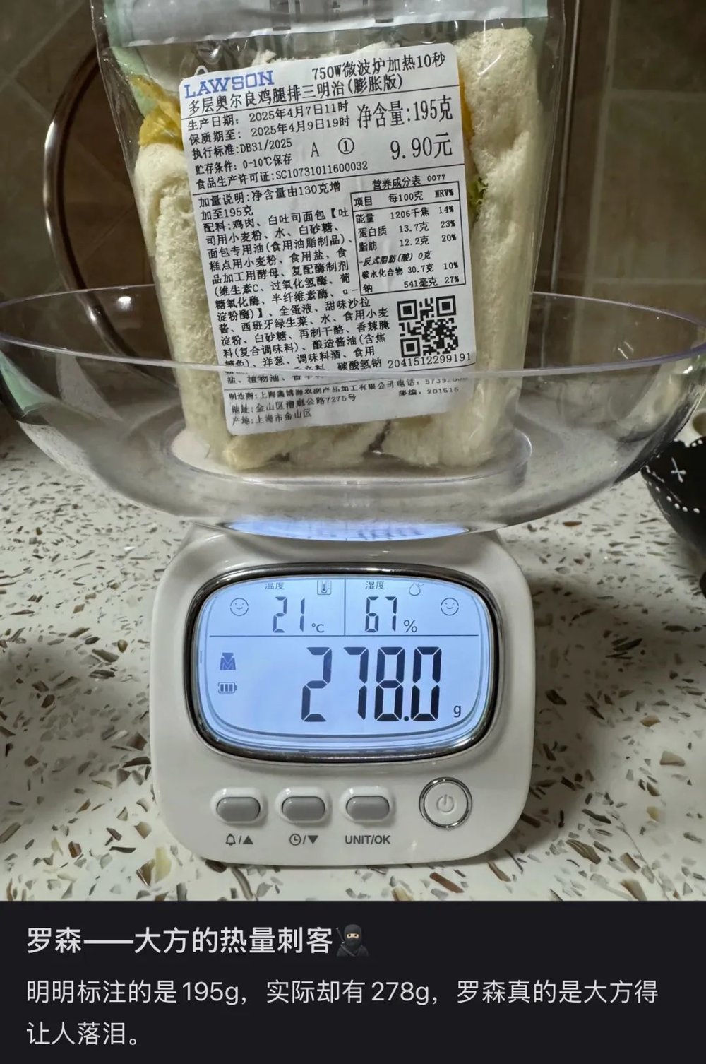 有网友在便利店买了一块标重110克的三明治,回家放到秤上后居然显示出150克,超出了标准重量近三分之一。