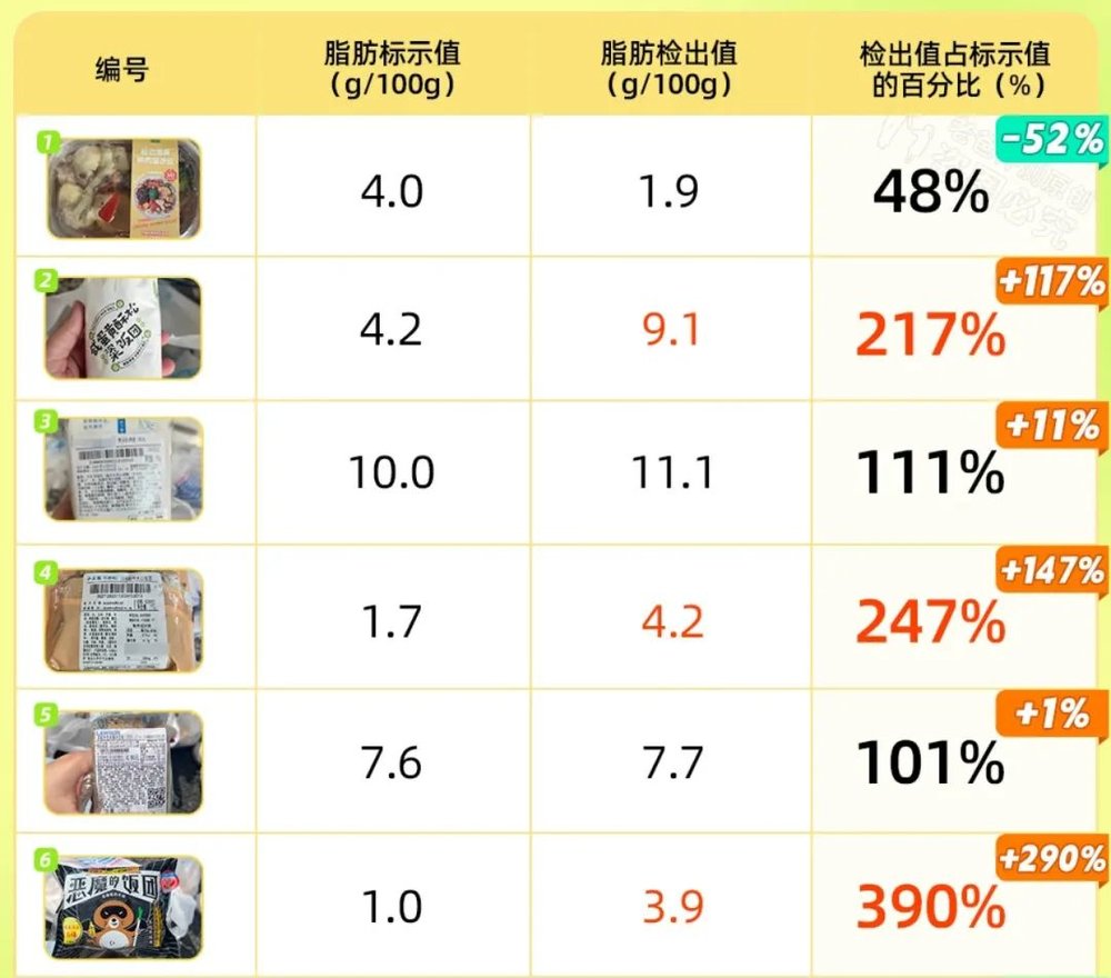 得出的结果是:5款脂肪超标,4款能量超标,重量也基本没有幸免。