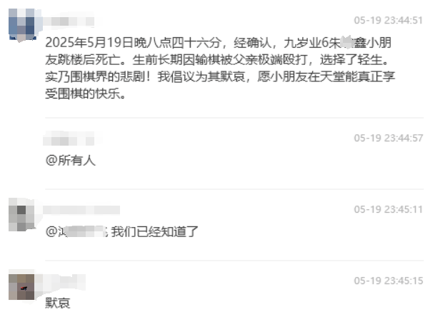 孩子是下围棋的,小小年纪就升到了业余6段,很有前途,可多次由于输棋被父亲殴打,不堪忍受,跳楼自杀,年仅9岁。