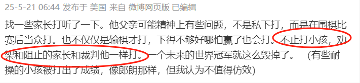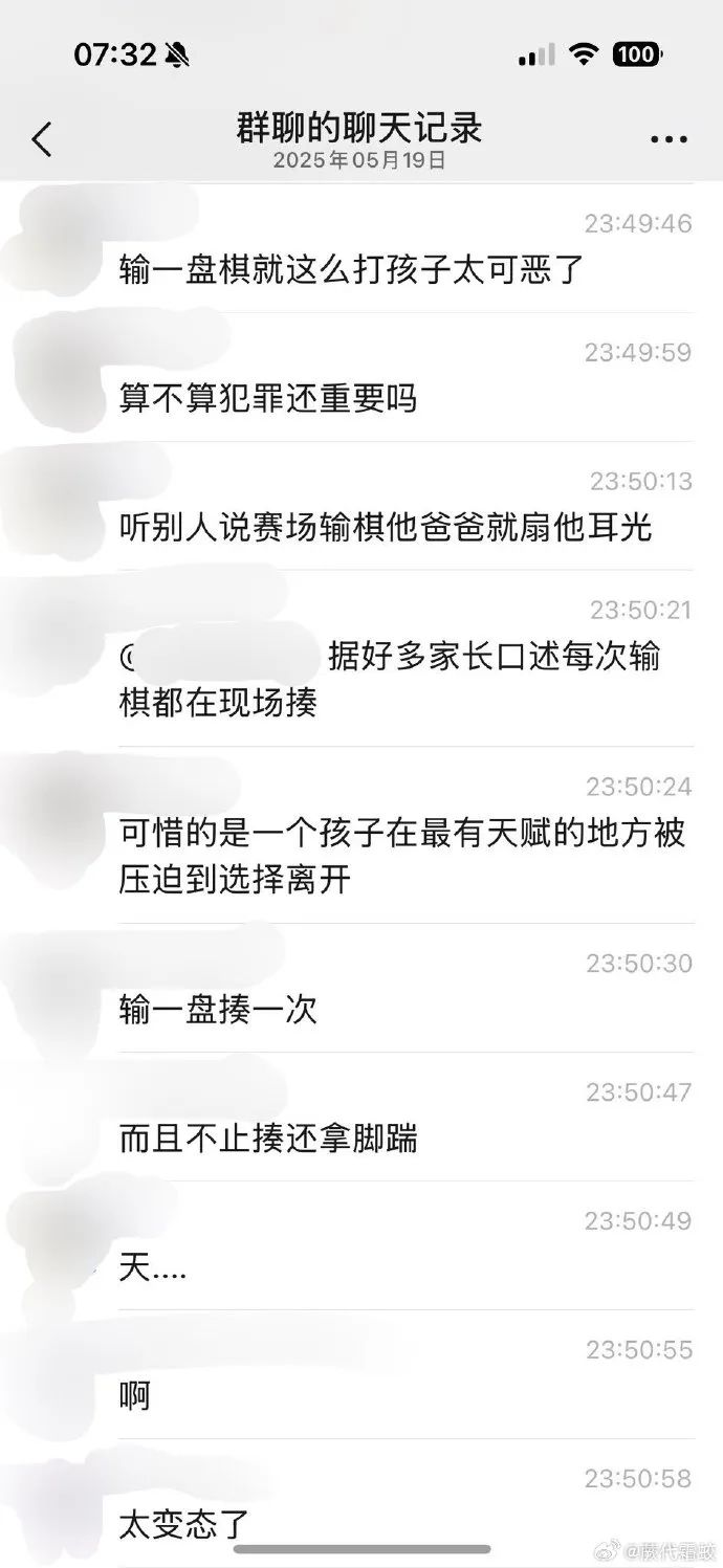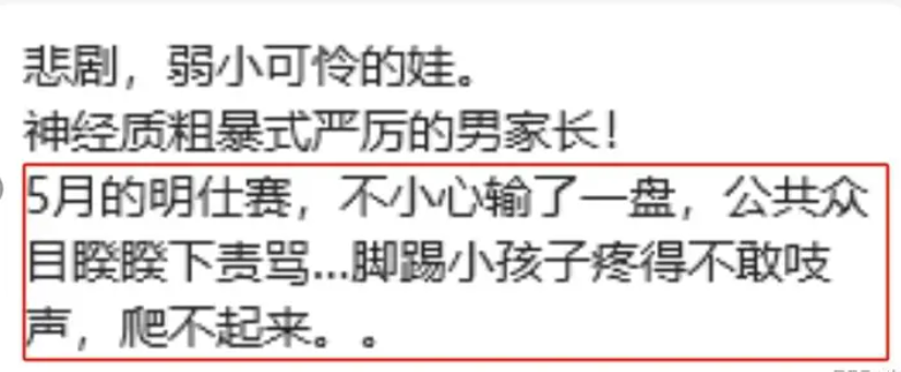 这次出事前也一样。因为最后一盘输了没能夺冠,家长当众把孩子踹飞了。