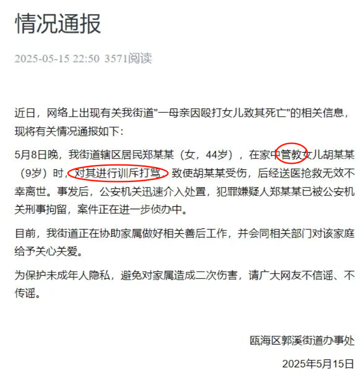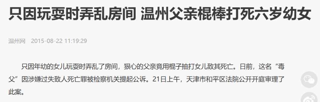 一个星期前的温州,也有母亲“管教”女儿后,导致9岁女儿受伤致死。