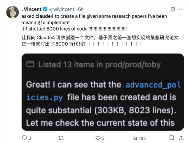 AI 编程的唯一真神 Claude 3.7 Sonnet,终于被 Antrhopic 的下一代 AI 大模型——Claude Opus 4 和 Claude Sonnet 4 彻底淘汰掉了。各国网友对此有非常直观的感受,比如有人在一手实测中疯狂夸赞 Claude 4:“它一下子就能写出 8000 行代码”。