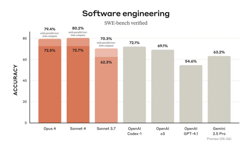 先从评分开始看起。Claude 4 模型在用于评估真实软件工程任务性能的 SWE-bench Verified 基准上堪称“遥遥领先”。值得一提的是,在本次评分对比中,Claude 4 特意被拉来与 OpenAI 前几天刚刚高调发布的“最强 AI 编程智能体 Codex-1”进行正面较量。