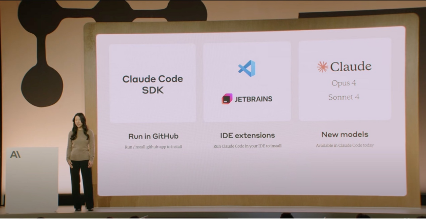 除了 Claude 4 发布之外,整场发布会的另一个侧重点是:Claude 代码已经发布。用户已经能够通过终端、IDE (VS Code 和 JetBrains)及通过 Claude 代码 SDK 后台将 Claude 融入开发流程。用户可以在终端中直接利用 Claude,瞬间搜索百万行代码库。