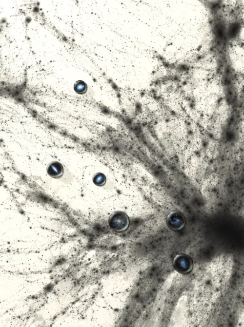 宇宙大尺度暗物质分布艺术图。水珠中呈现不同环境下的矮星系图像,展示了宇宙大尺度结构与小尺度星系形成之间的复杂关联。