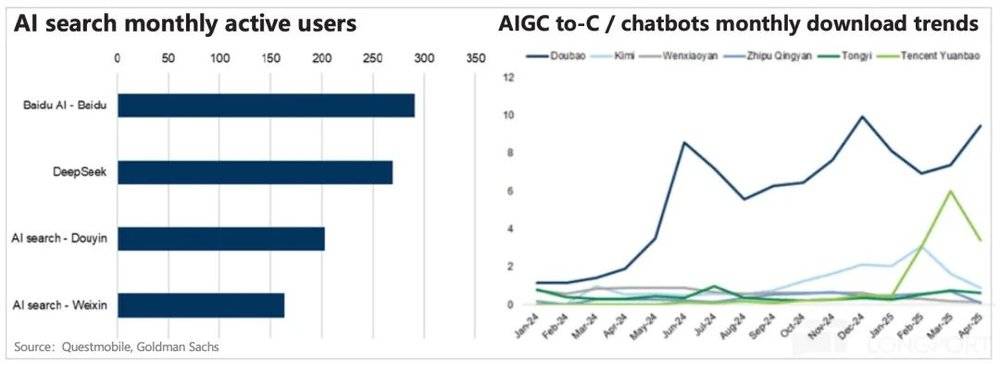 单纯看AI聊天机器人终端流量,文心一言落后差距扩大。同行中,二、三月DeepSeek、元宝猛飚,但四月就只剩豆包独孤求败了。除了有先天优势、巨量用户以及娱乐场景优势的豆包,其他独立平台似乎都比较难保持扩张,需要借助原先的场景,比如百度搜索、微信。