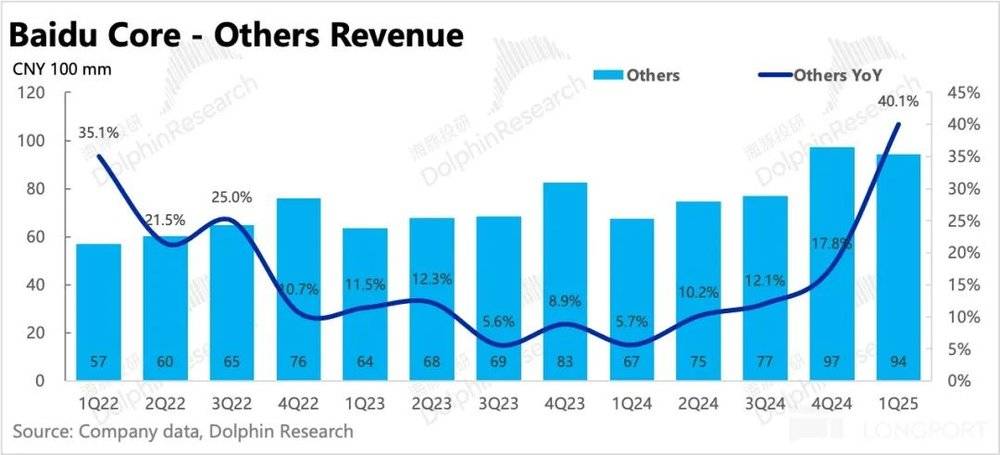 百度核心的其他业务(非广告业务)中,近70%的收入来自智慧云,剩余的30%主要是自动驾驶技术方案、智能音箱等收入。四季度其他业务收入94亿,同比增长40%,相比上季度明显加速。其中智慧云在DeepSeek下,增速飚至42%,远超市场预期的增速25%。