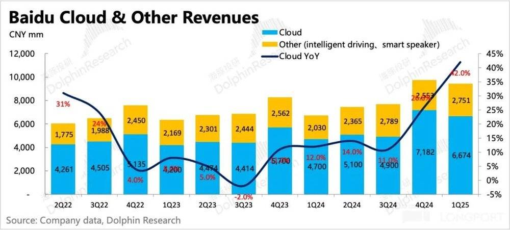 1. 提供全网最低价的DeepSeek,智慧云增速被拉爆:百度算是误打误撞第一波吃满了DeepSeek红利的平台。在DeepSeek大火之后,百度不仅当机立断快速引入,并且搞起大促销,提供全网最低价的算力,直接让智慧云增速由上季度的28%飙升到这季度的42%。