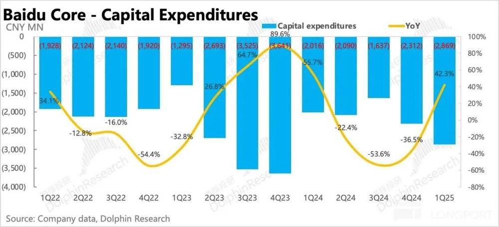 从资本开支上看百度对AI服务器、芯片的投入,一季度资本开支正式重启扩张,上季度环比增加,就已经存在扩张迹象。虽然不排除有芯片限购下的提前抢买来拉动,但DeepSeek带来革命性的大模型新研发路线,大幅降低了企业试错成本后,显然还是刺激了一波需求。这也使得上游的“铲子商”也增加投入扩大供给。
