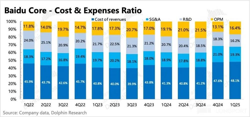 5. AI内部提效还在继续:百度或许还没从AI获得太多外部红利,但内部提效已经快持续了一年。一季度除销售推广有增加外,研发费用仍在加速下滑,由此体现AI对内部经营效率的提升作用,这一点其实可以同时类比到其他研发投入占比较高的互联网平台。
