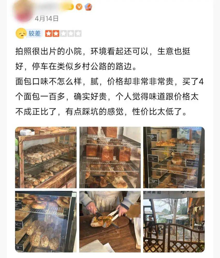 首先是性价比。尽管不少消费者愿意为乡村面包店的环境买单,但其客单价普遍较高,不少人也在社交平台上留言称:“面包口味不怎么样,价格却非常贵,4个面包100多”“说是窑烤,看起来像预制的,面包都是30以上,性价比很低”“性价比确实不高,如果专门开车过去消费有点不值得”……