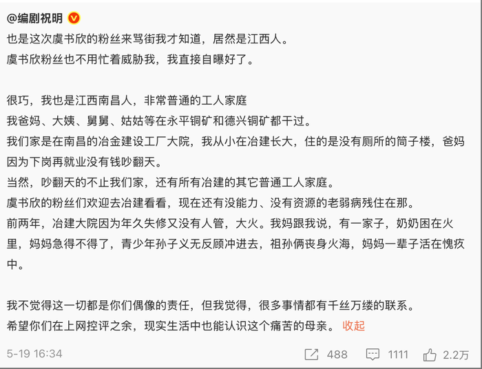 《旋风少女》编剧祝明针对娱乐圈二代进行过这样的发言:“早就等着扒她家(指虞书欣家)的瓜了,该来的终归要来的。这么说吧,影视行业所有卖“家境富裕”人设的,顺着查一遍,99.99999%都有料。”这一条微博获得了4.6万赞。祝明对虞书欣家庭的情况非常上心,一大原因是她和虞书欣一样都生活在江西的钢铁产业之家,前者生活在南昌的冶金建设工厂大院,而这里年久失修,居住条件差,工人下岗陷入贫困,而在此情况下,虞书欣的爷爷“就是爱跳舞的可爱富裕小老头,还能去上海买豪宅”。虞书欣家人的财富从何而来,与祝明和她关心的人们有着切身的关系。
